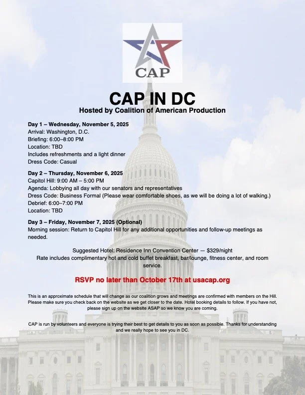 We must act now to make the U.S. a competitive and attractive place for production once again. That’s why the Coalition for American Production (CAP) is turning to Washington, D.C., to advocate for a federal tax incentive that brings jobs and opportunities back home.